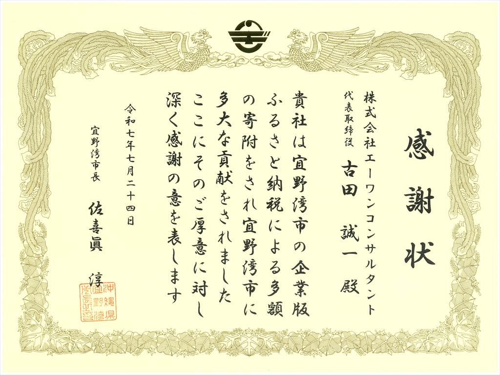 沖縄県宜野湾市よりふるさと納税の感謝状を頂戴いたしました。また、宜野湾市の広報誌にも掲載いただきました。今後とも様々な活動を通して地域活性や地域創生に貢献してまいります。 社長(左から2番目)が贈呈式に参加いたしました pickup この記事を書いた人 エーワン広報 記事一覧
